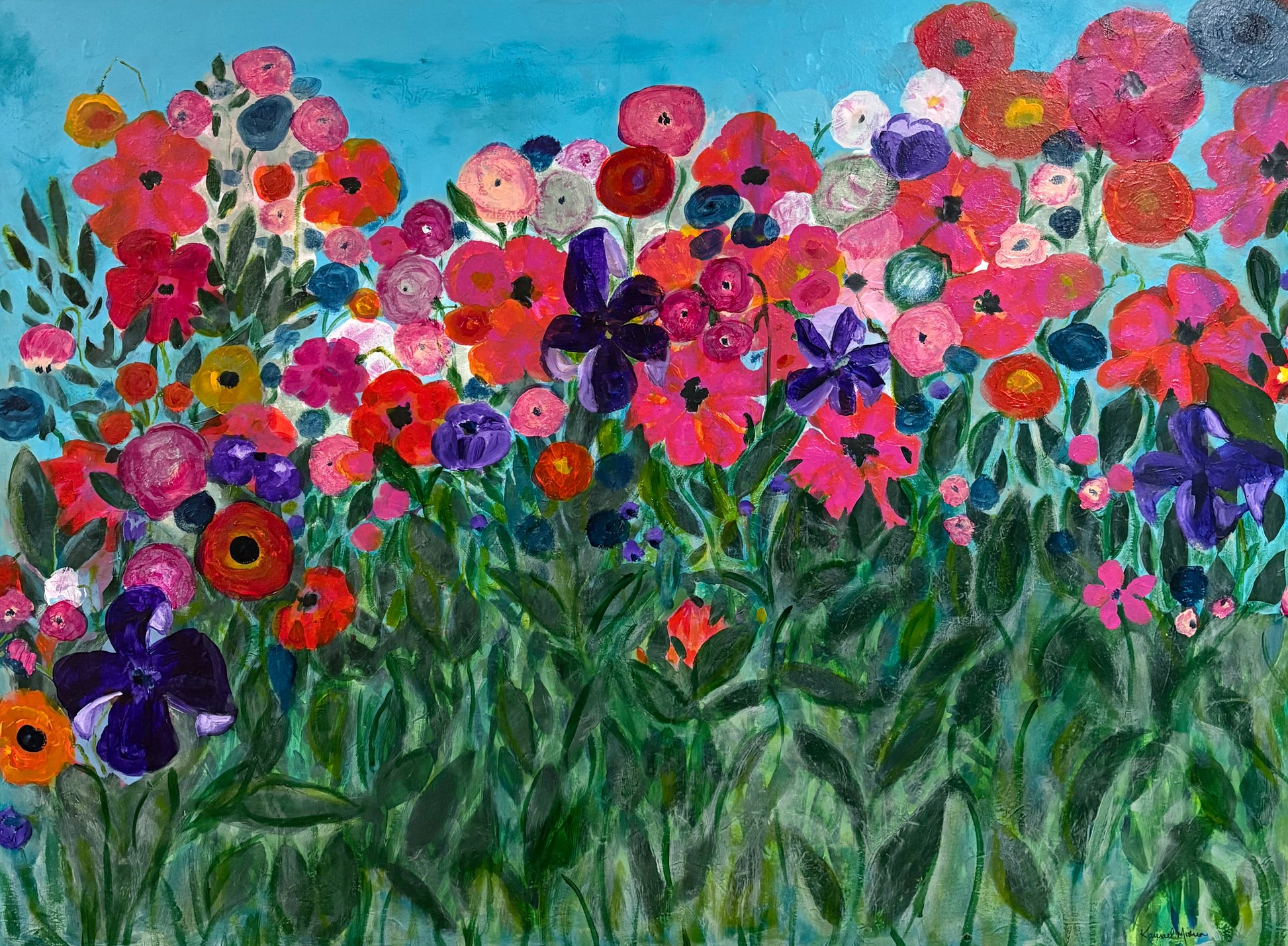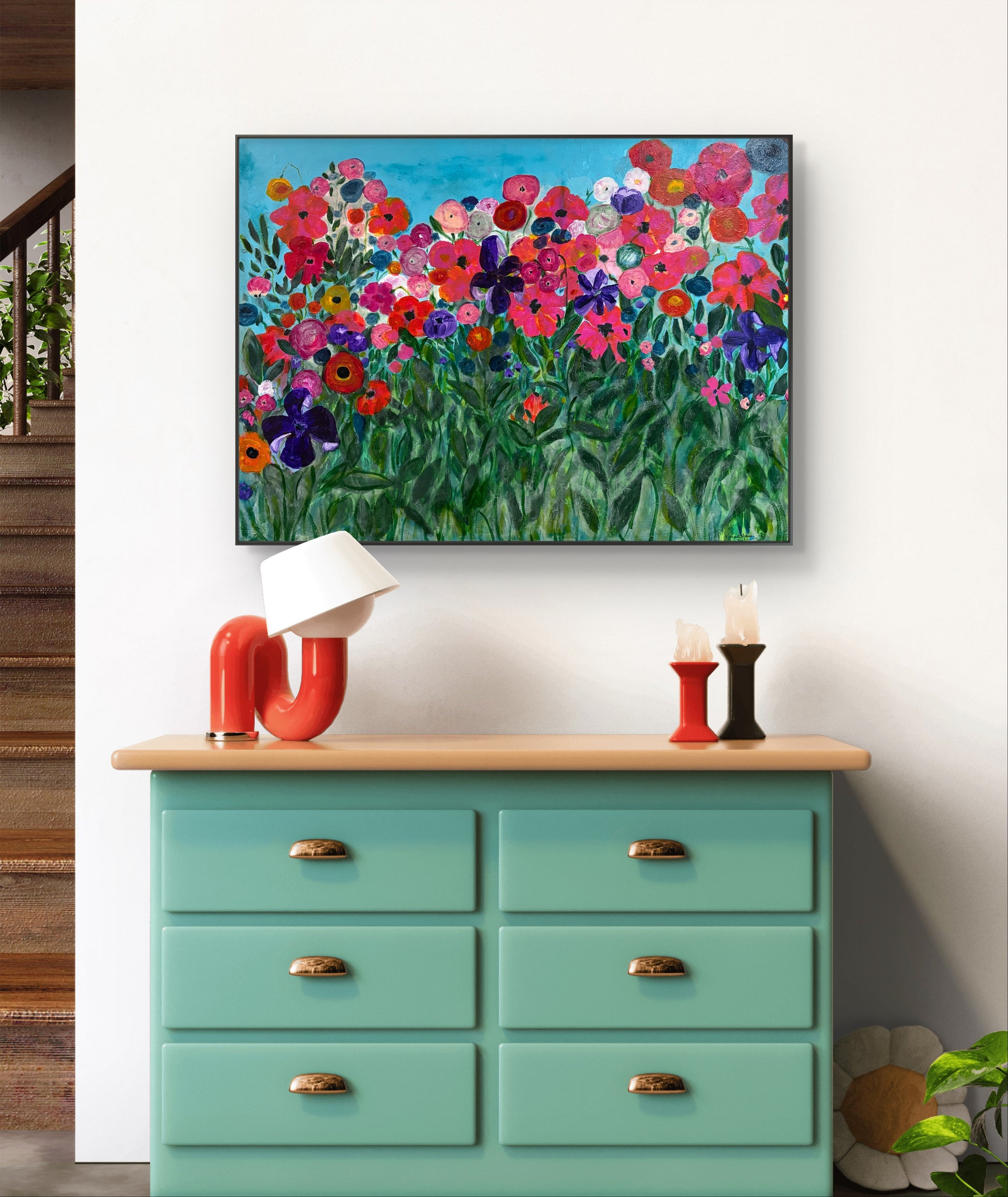 This stunning piece features a colorful collection of vibrant flowers that will add a touch of beauty to any space. Let your imagination run wild and bring a sense of calm and joy to your environment. Sold with a black metal frame.